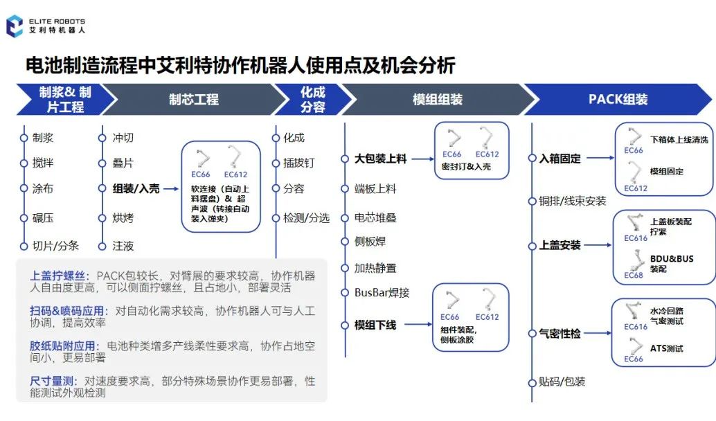 PACK段:主要应用于极耳裁切、清洗、贴胶、检测等工艺段,该工艺段对臂展要求高,协作机器人臂展较大,部署更便捷。