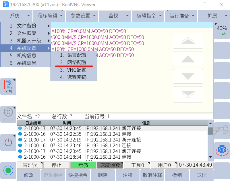 VNC是一款优秀的远程控制工具,Elite_EC系列机器人内部已经集成VNC服务器,用户可以通过网线链接即可在电脑上进行查看、控制机器人的示教器界面。