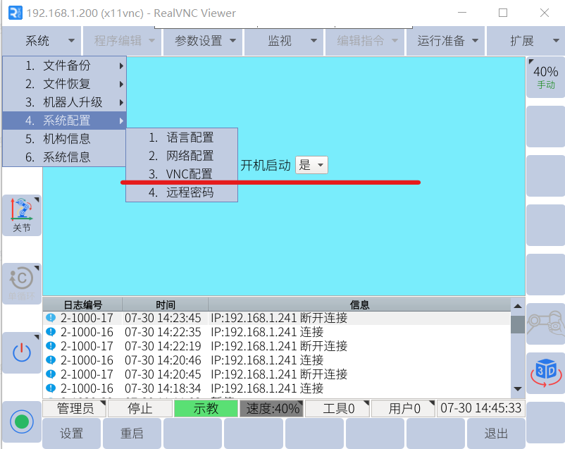 3. 机器人侧在系统配置-VNC配置中,修改为开机启动并设置,同时点击启动按键,当示教器窗口出现VNC已启动和VNC设置成功后即可。