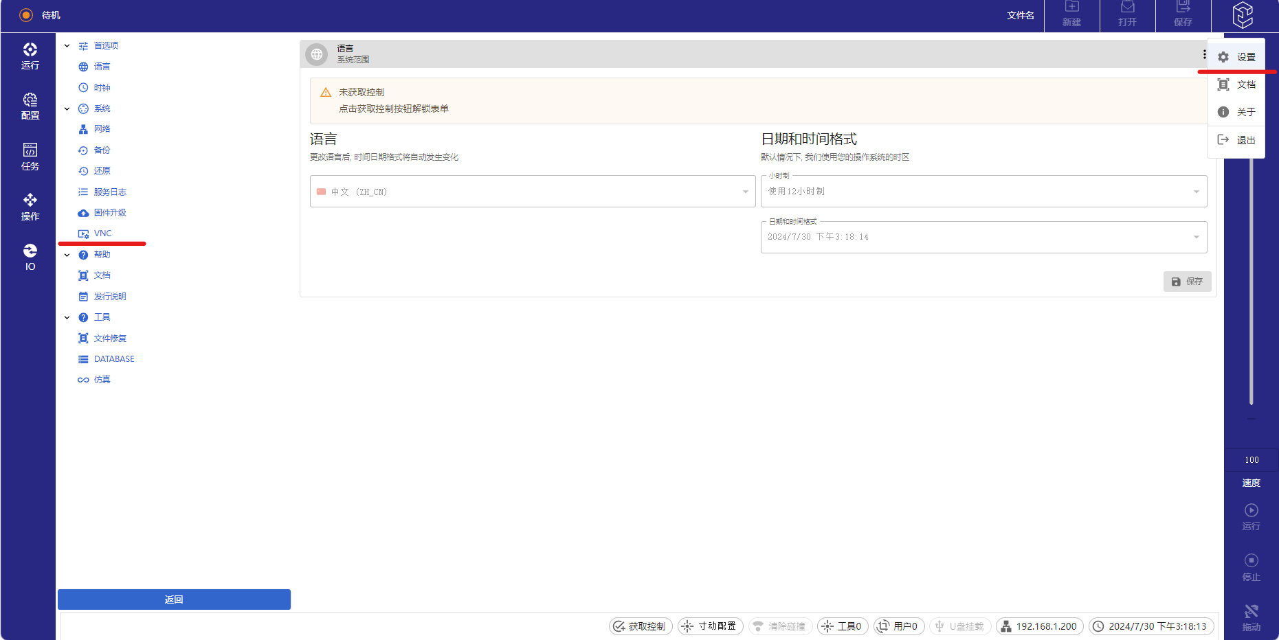 3.12及以上版本开始支持全新的网页示教器,其功能更丰富,若还想在网页示教器使用VNC功能按照如下步骤: 先点击右上角NG28娱乐logo,点击设置,再点击VNC即可进入