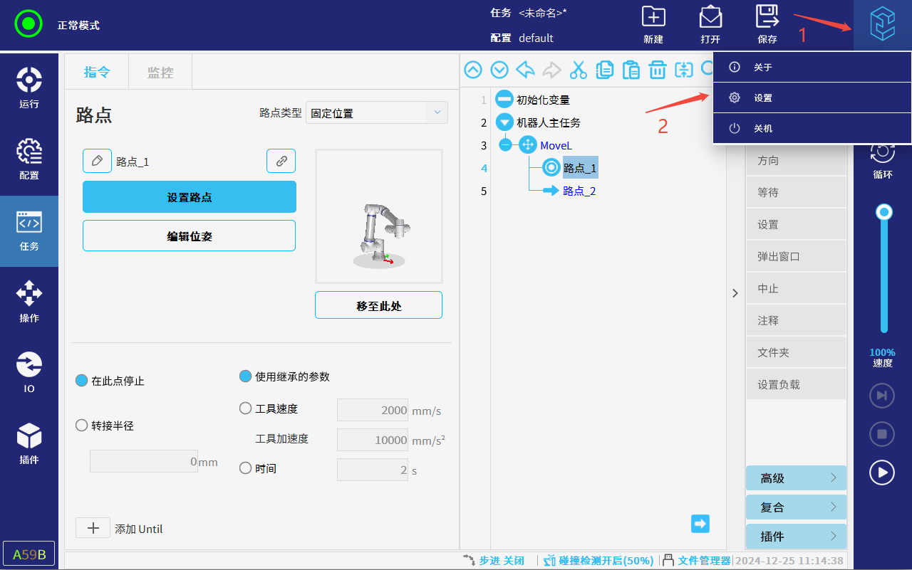 把插件放在U盘插入示教器U盘接口,点击右上角ELITE图标,再点击设置(需要的相应插件请联系ELITE技术人员)