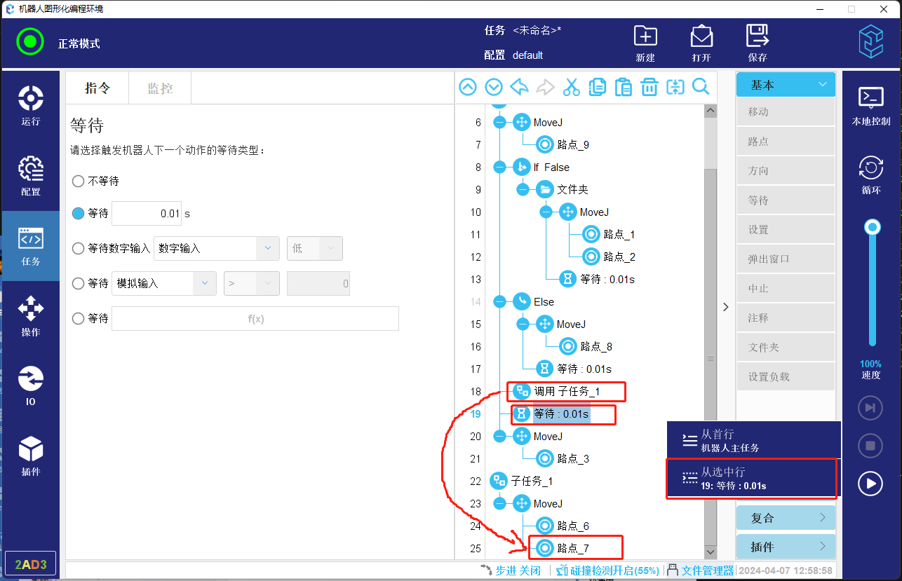5. 如果起始行的上方存在子任务节点,则会找到该子任务节点的终止位置作为起始位置。如下方图-14所示任务,如果以第19行作为起始行,则会找到路点_7作为起始位置。