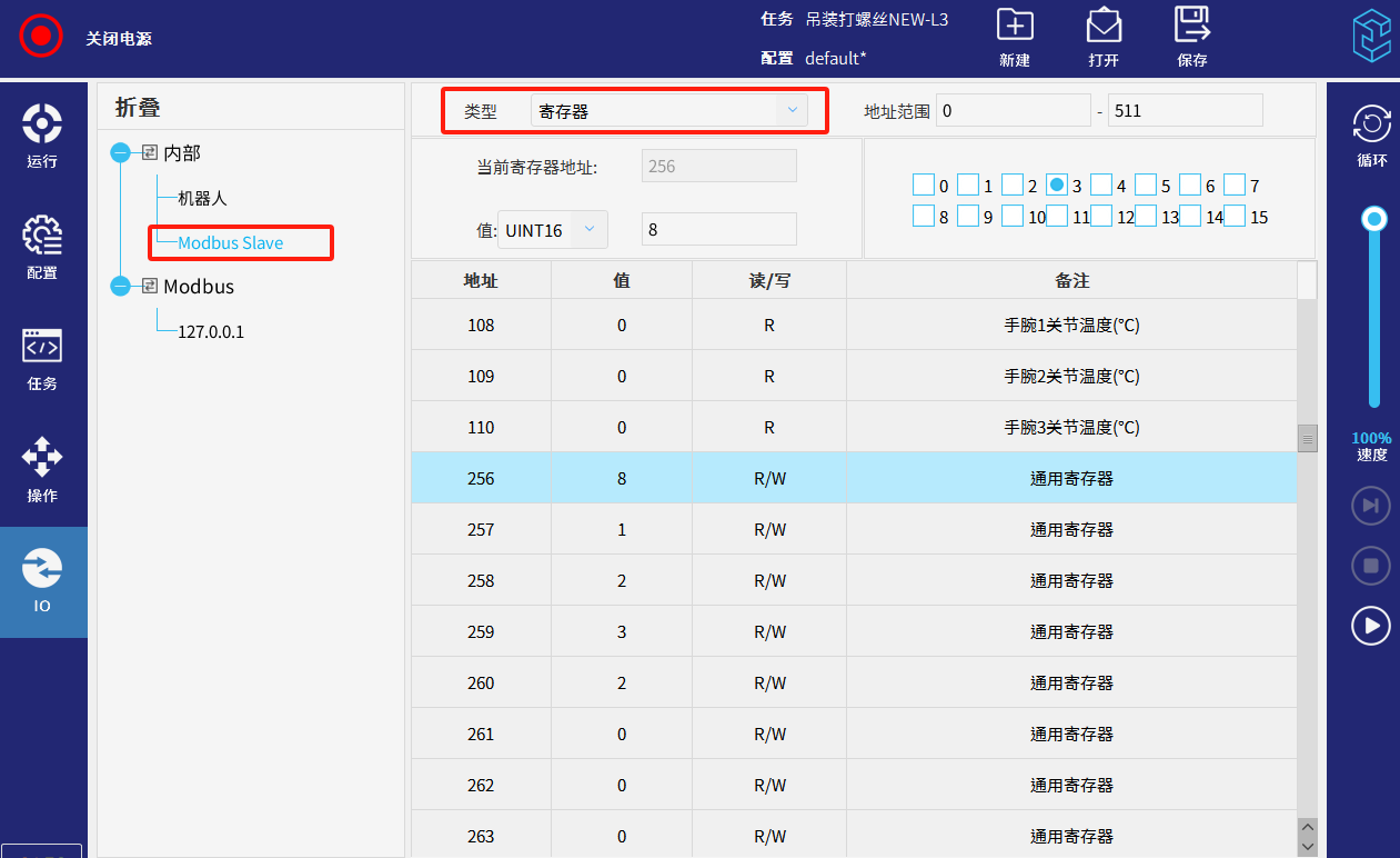- 内部--modbus slave,可以查看状态和控制(数字输出32,通用寄存器256地址开始)