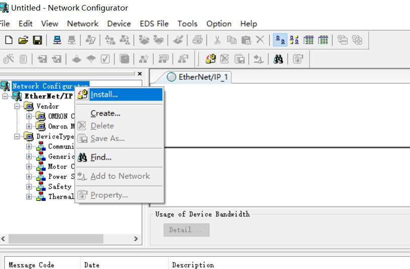 2、 首先打开Network,这个软件可以帮NG28娱乐看到适配器插槽对应变量的大小,以及目标变量,右击左边栏Network Configurator图标,选择install,找到对应的EDS文件