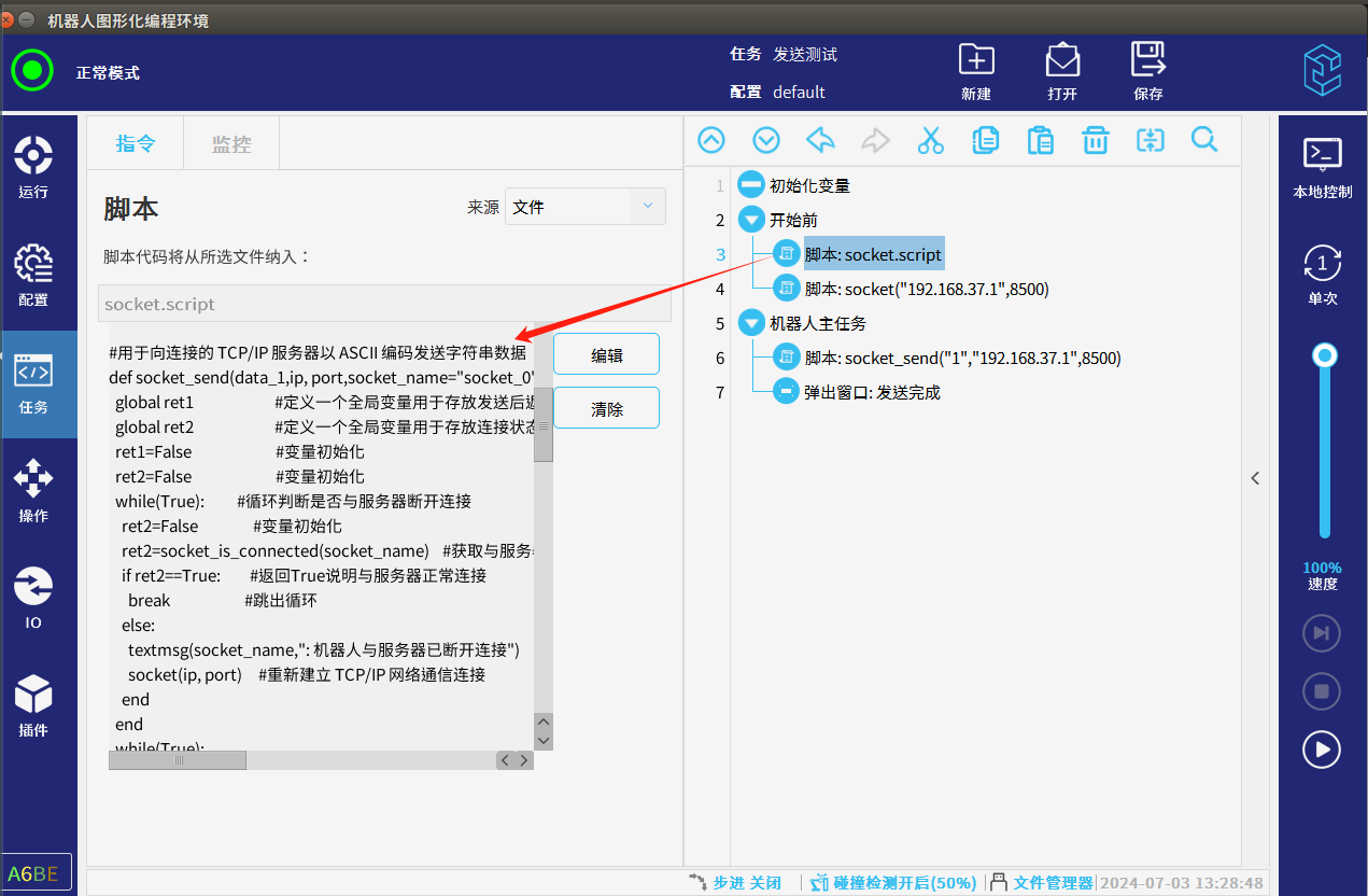 2.为了避免图2-1的情况发生,NG28娱乐可以利用发送指令的返回时作为判断是否发送成功,发送失败时一直发送直到发送成功为止,发送失败的情况一般都是机器人客户端与服务器断开连接时出现的,所以NG28娱乐可以在发送前和发送失败后通过“socket_is_connected()”判断与服务器连接的状态如果断开重新连接再次发送,如图2-2所示,可以用下面代码2-1配合图2-3的图形化编程直接调用df脚本实现此操作。