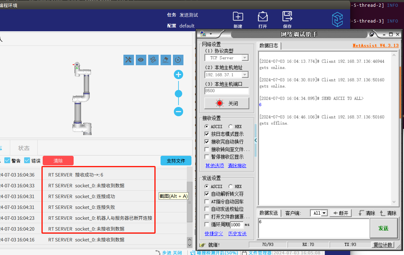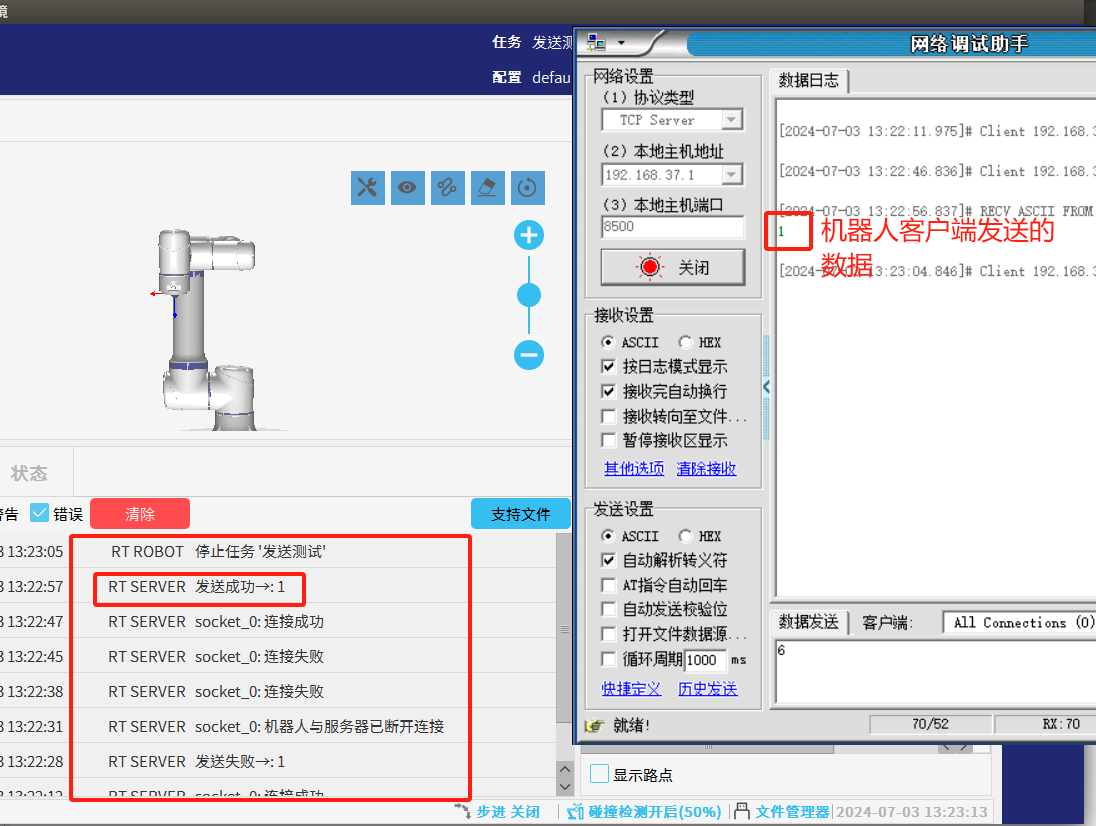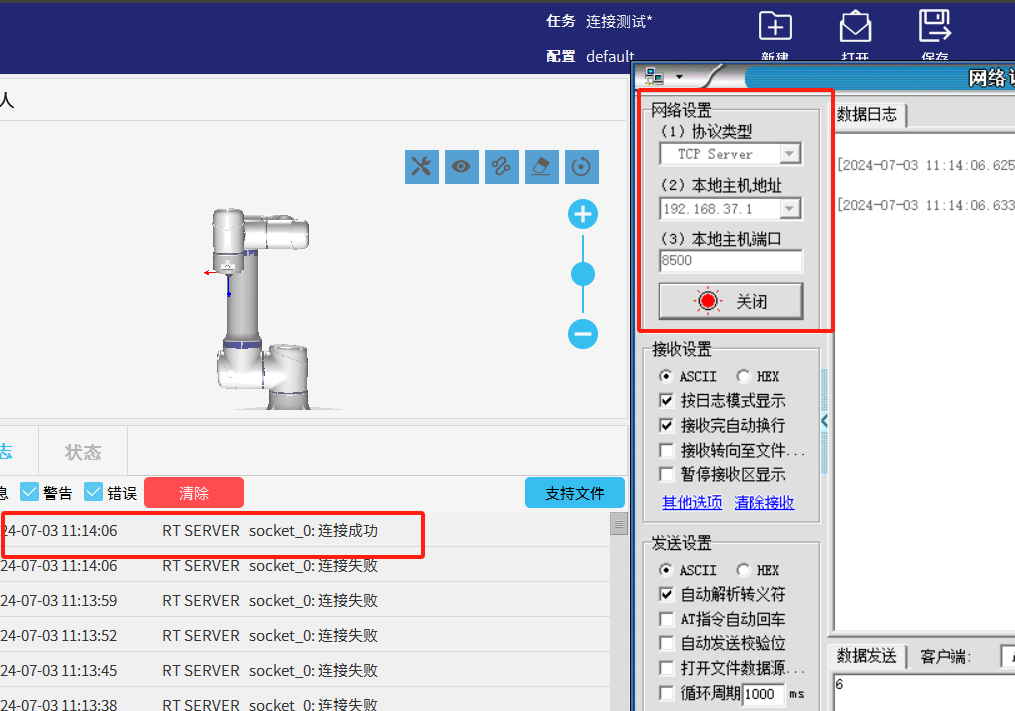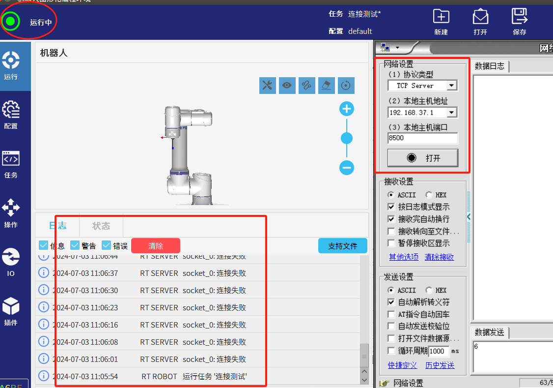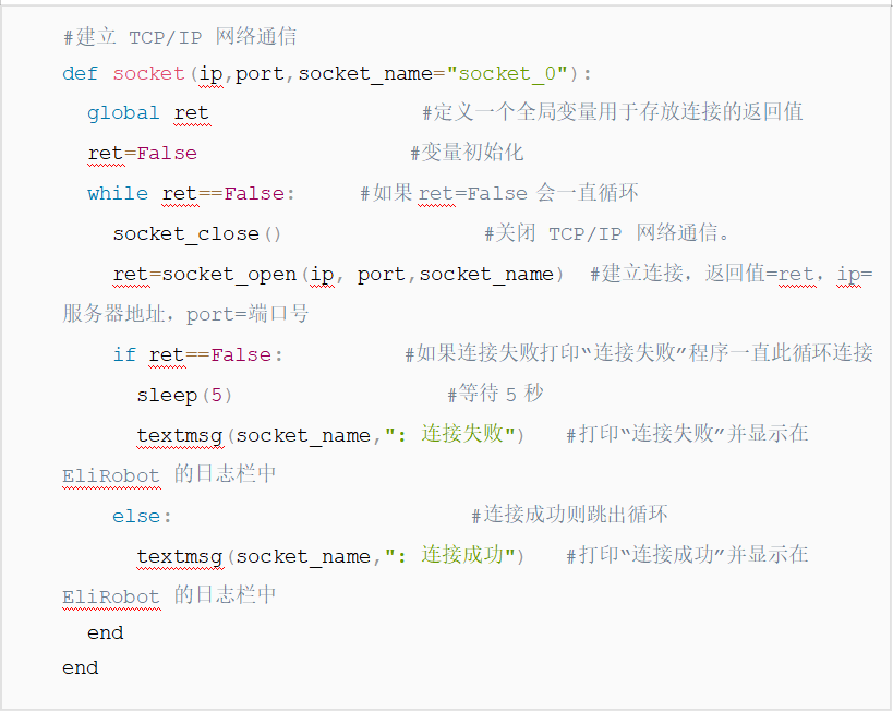 2.为了避免图1-1的情况发生NG28娱乐可以利用socket_open()建立 TCP/IP 网络通信时的返回值做条件判断循环连接直到连接成功后程序才继续往下运行。如图1-2所示如果服务器未打开时机器人会一直与服务器建立连接并打印“连接失败”到EliRobot 的日志栏中。
