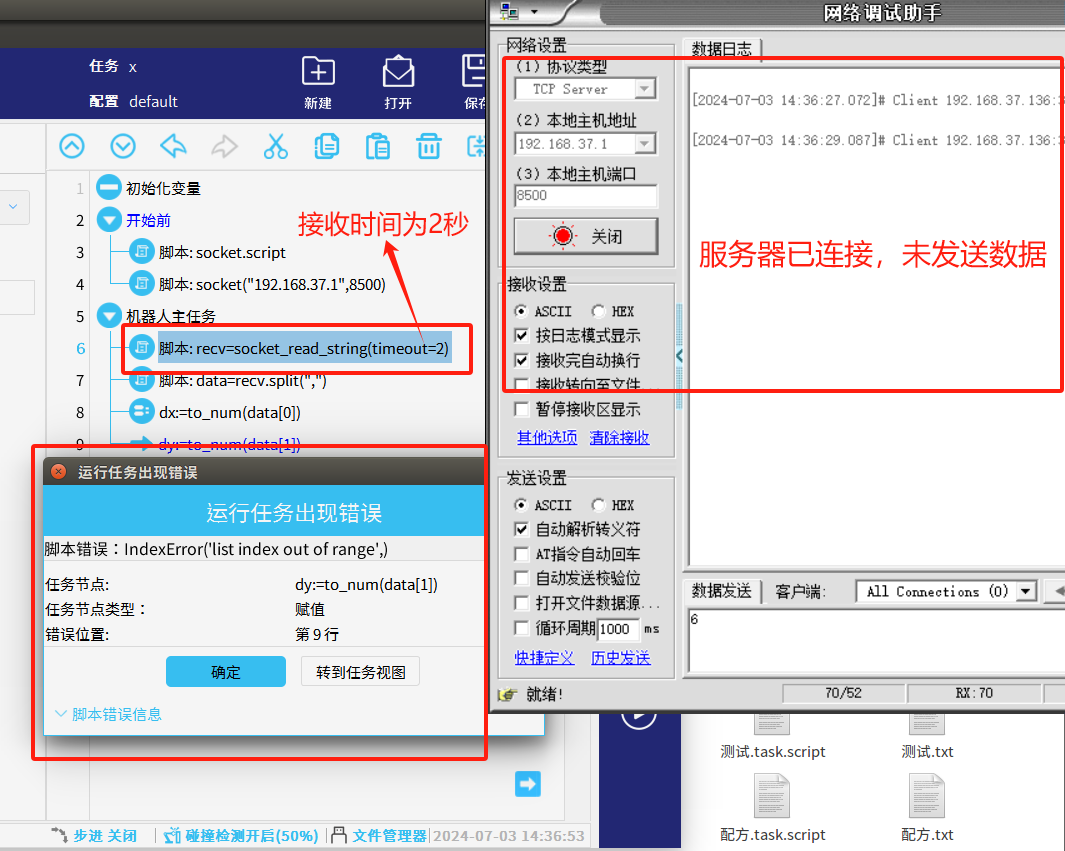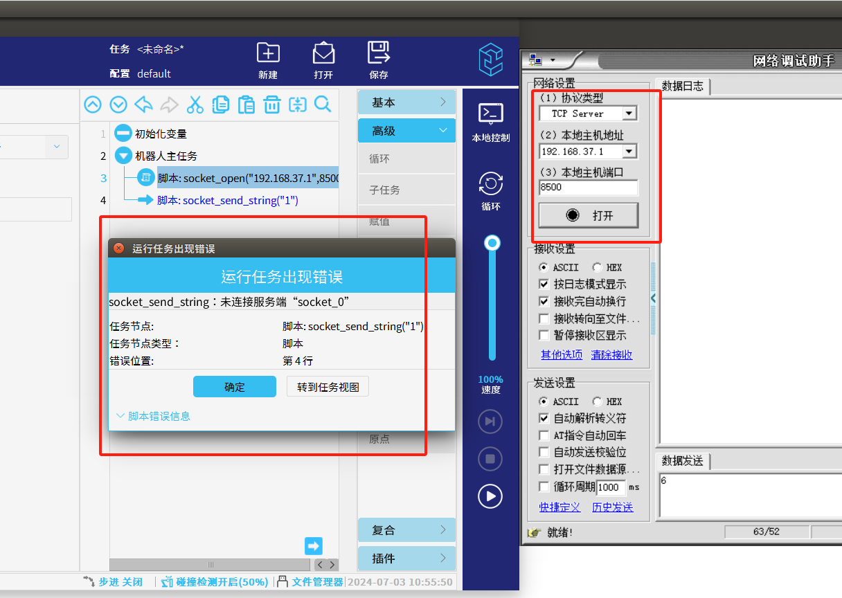 1.当NG28娱乐单纯使用 socket_open()建立 TCP/IP 网络通信指令时,如果服务器还未打开时,机器人端户端未连接到服务器,程序依然往下运行,运行到发送/接收时机器人就会报错如图1-1所示,这样机器人就必须初始化重新运行。