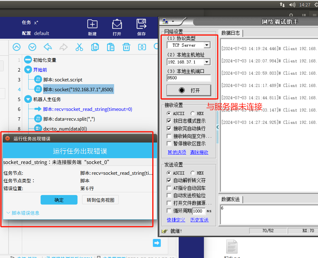 a:如果当机器人与服务器未连接时就接收数据就会如图3-1所示报错,此时程序已经停止需要重新初始化程序。