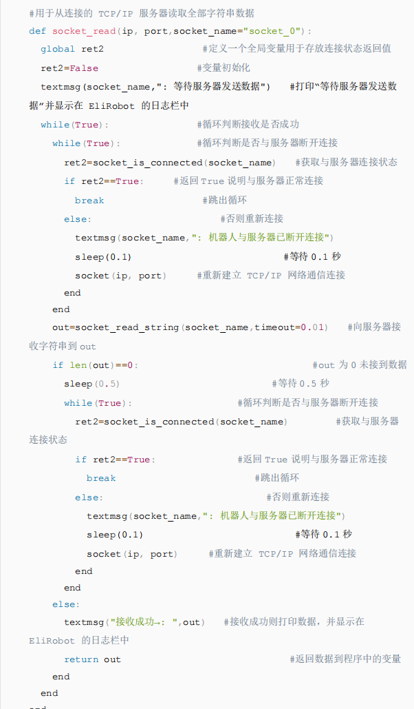 2.为了避免以上a.b两种情况发生,NG28娱乐可以在接收数据之前通过“socket_is_connected()”判断与服务器连接的状态如果断开重新连接,并通过再次接收接收指令例如“socket_read_string(timeout=2)”的返回值判断是否接收到数据,返回值为0时,再次接收数据,如图3-3所示,以用下面代码3-1配合图3-3的图形化编程直接调用df脚本实现此操作。