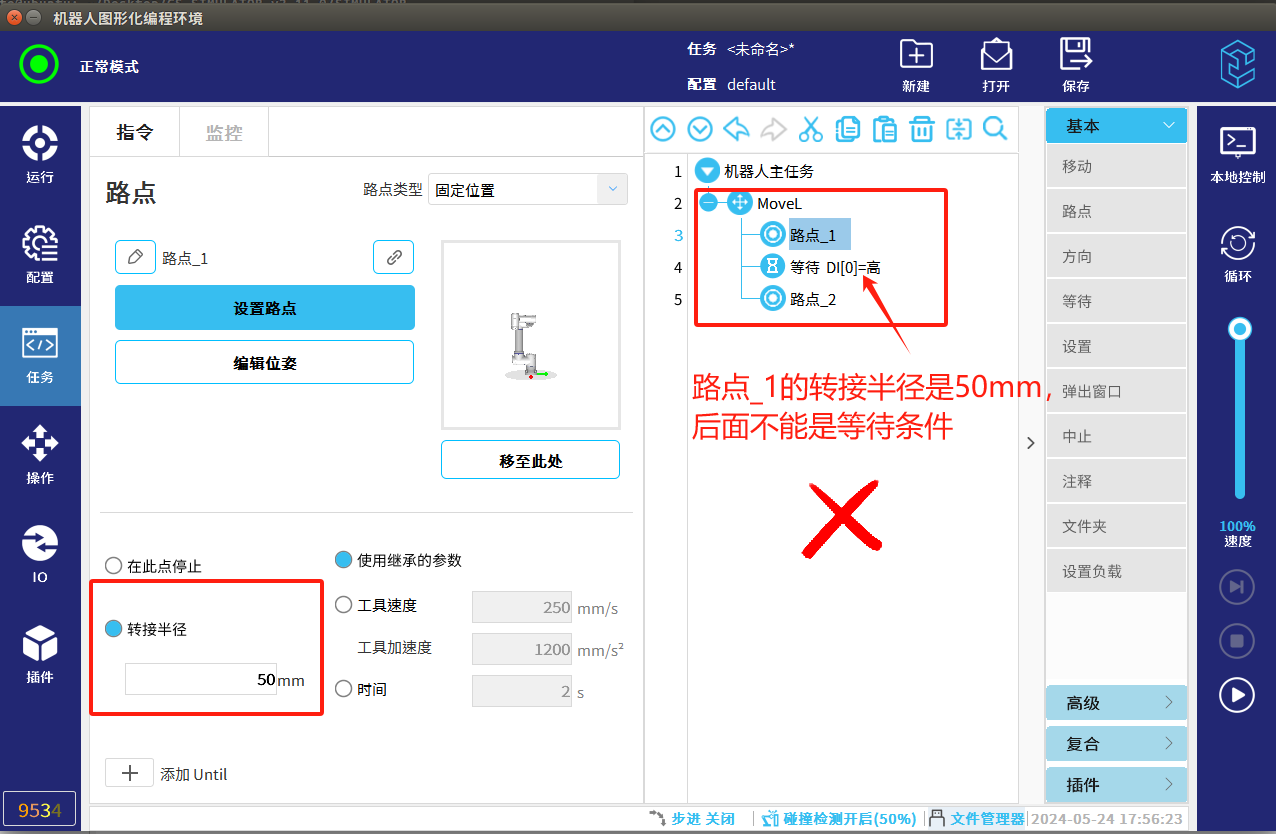 3.点位CR不为0 (转接半径),后面不能有时间等待或者条件等待。