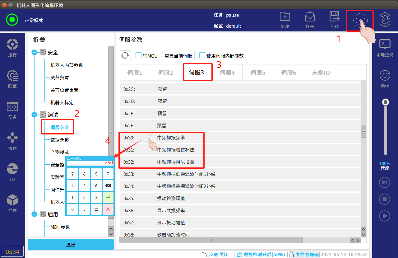 7.开始采集波形时,机器人会进入产测模式,调整参数完成后需要手动推出产测模式