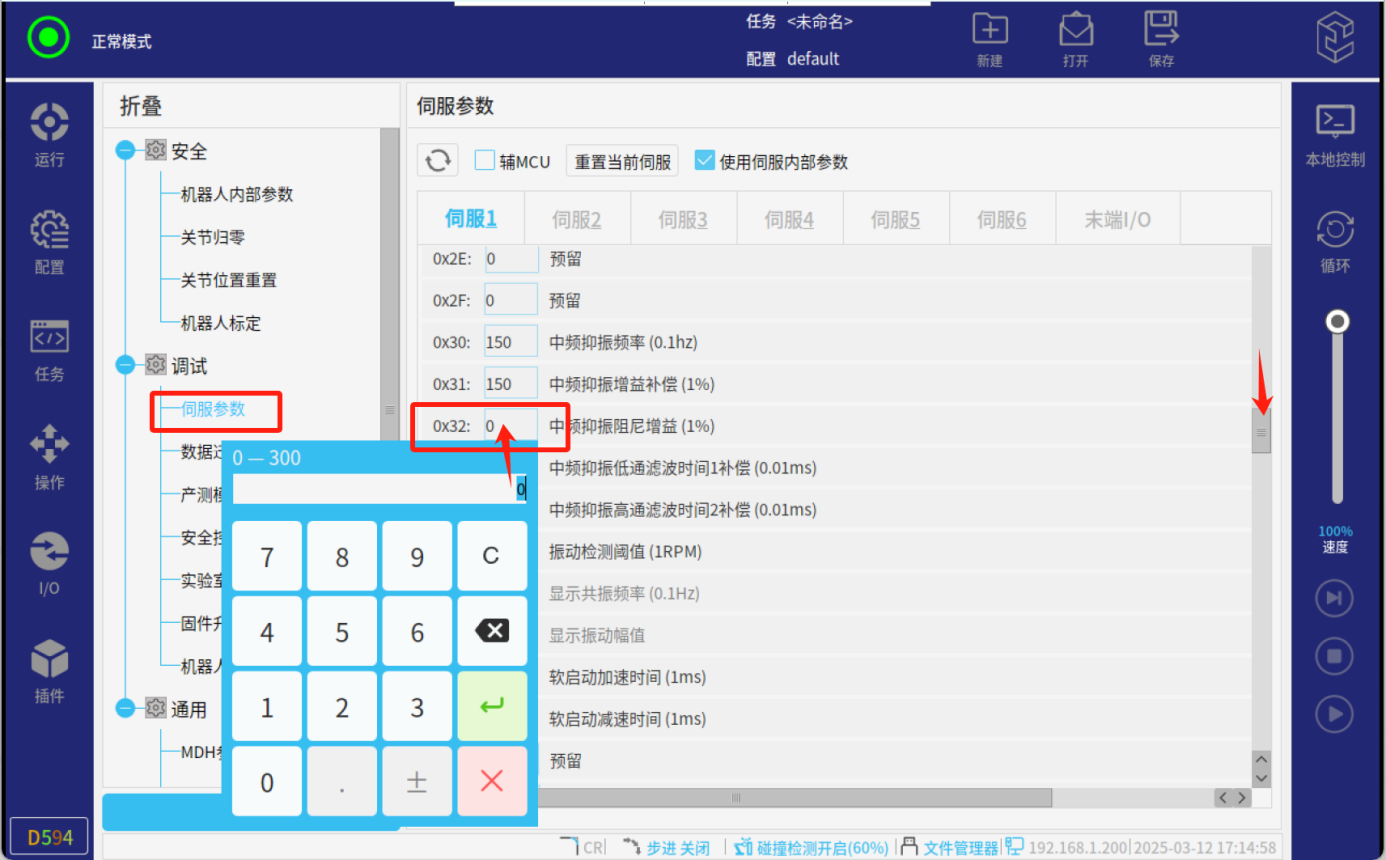 通常在出厂时,Pn0C 被设定为 0,即标准抑制模式,振动抑制参数均由控制 器下发。在后续使用机器人的过程中,若出厂设定的默认参数对于实际工况下的 抖动抑制能力达不到特定需求时,则可通过调整伺服参数Pn0C 进行自动低频抖 动抑制。