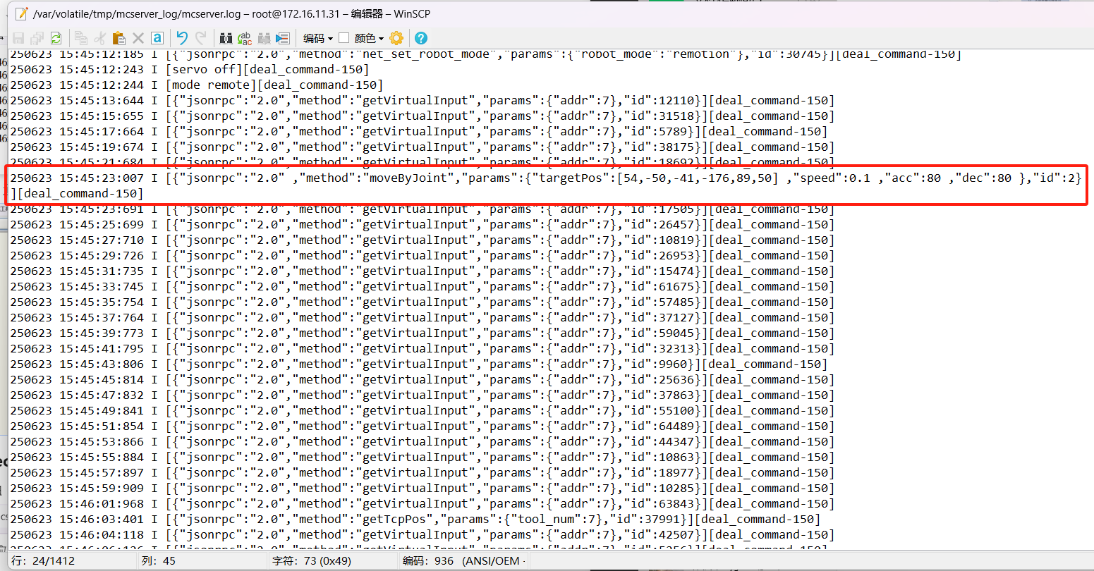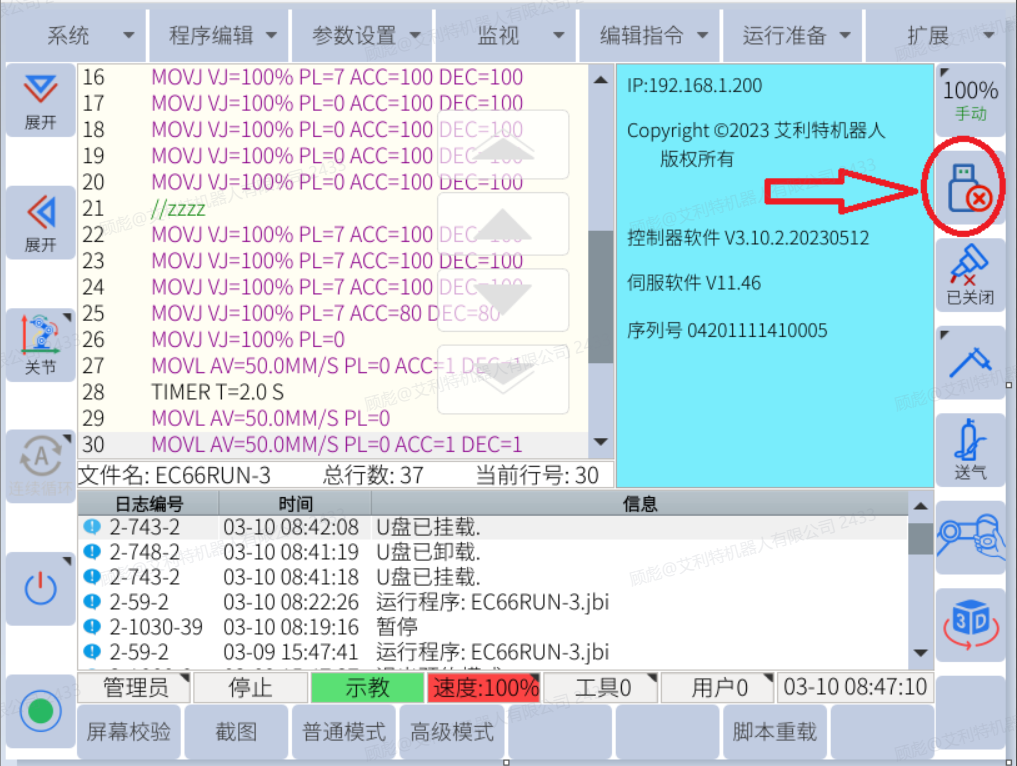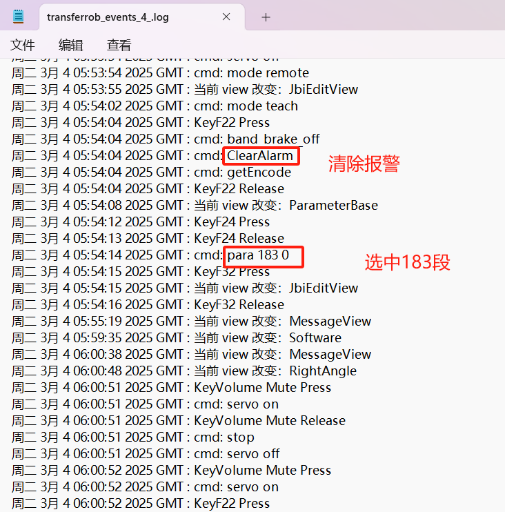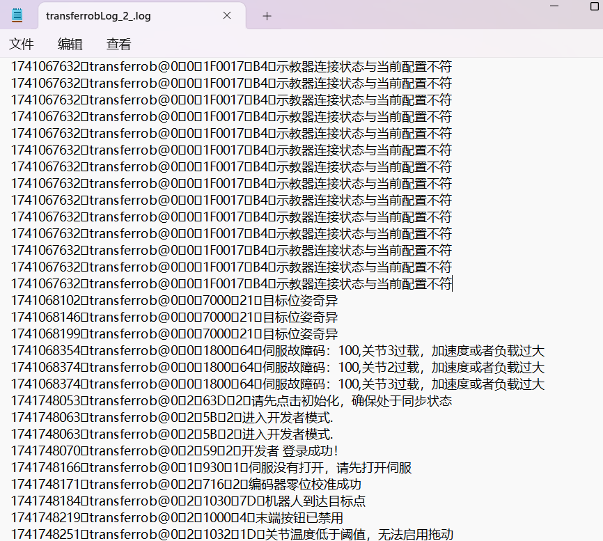 3、 该日志通过缓存刷新,如果上位机发送指令太少则不会在日志中记录,缓存到一定数量才会加载到日志中。(可通过登录网页版示教器增加缓存量,网页版示教器每 2秒自动缓存一条日志;也可上位机多发一些指令增加缓存量)