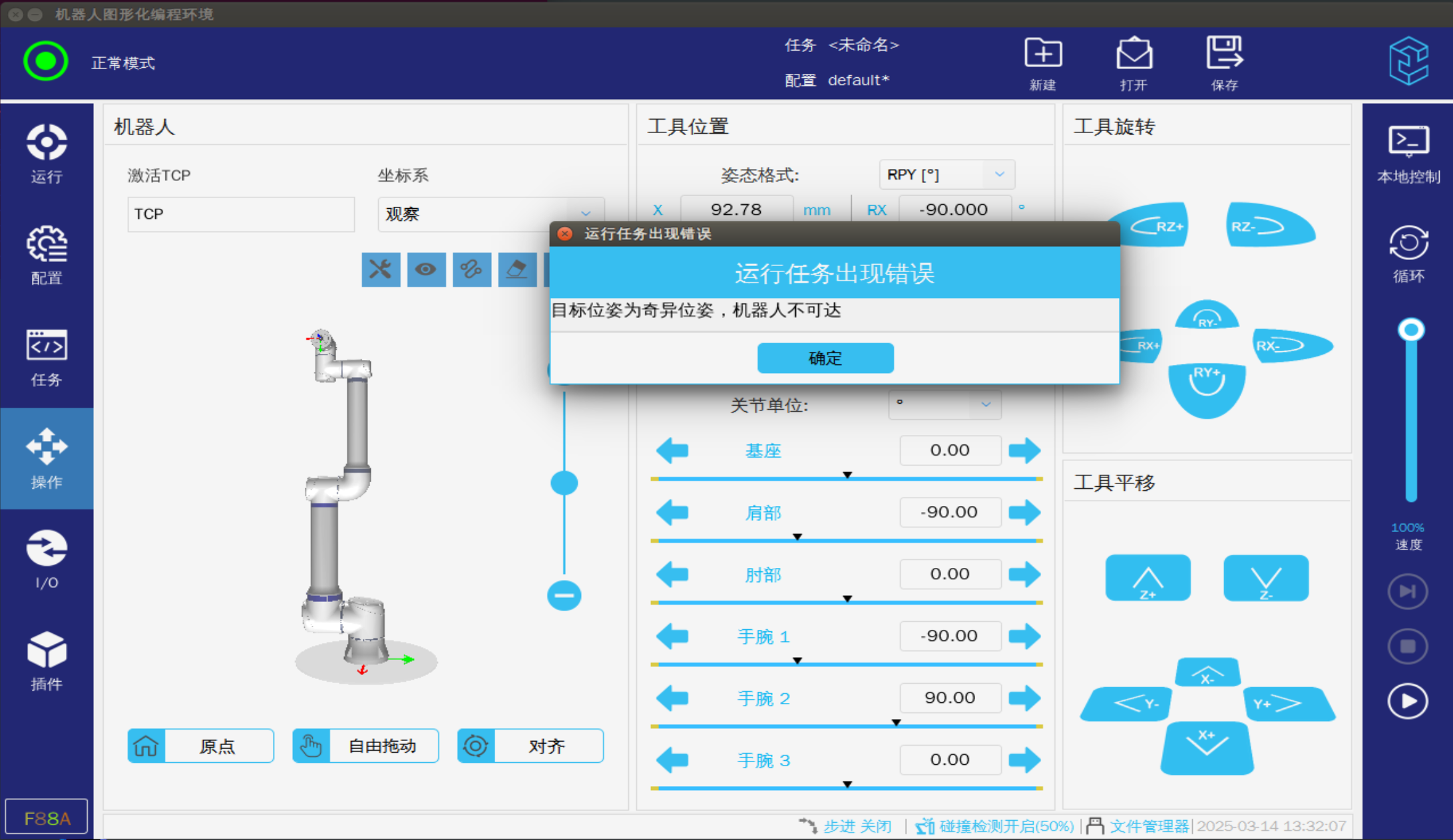 • 机器人进入奇异点时需要使用关节坐标将机器人移出奇异点