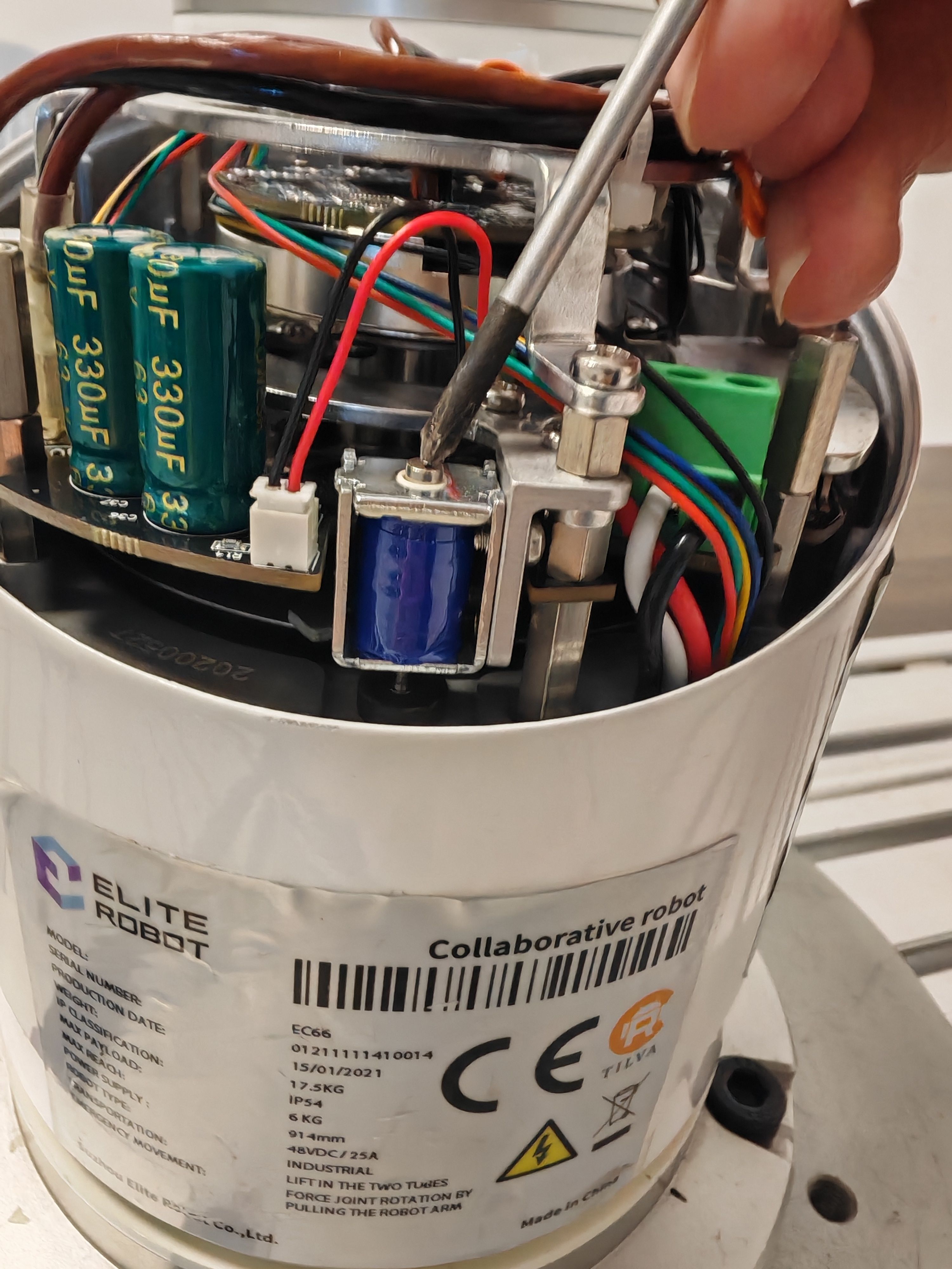 该文档主要针对当机器人断电后出现掉臂或者外力能够推动机器人时排查故障指导。目前EC机器人抱闸机构采用的为机械抱闸,由弹簧、销钉、电磁铁组成,原理为当机器人上电时,电磁铁吸合,抱闸打开,当机器人掉电时,电磁铁失电,弹簧弹出,锁住机器人,当出现掉臂或者外力能够推动机器人时大概率为抱闸机构异常。
