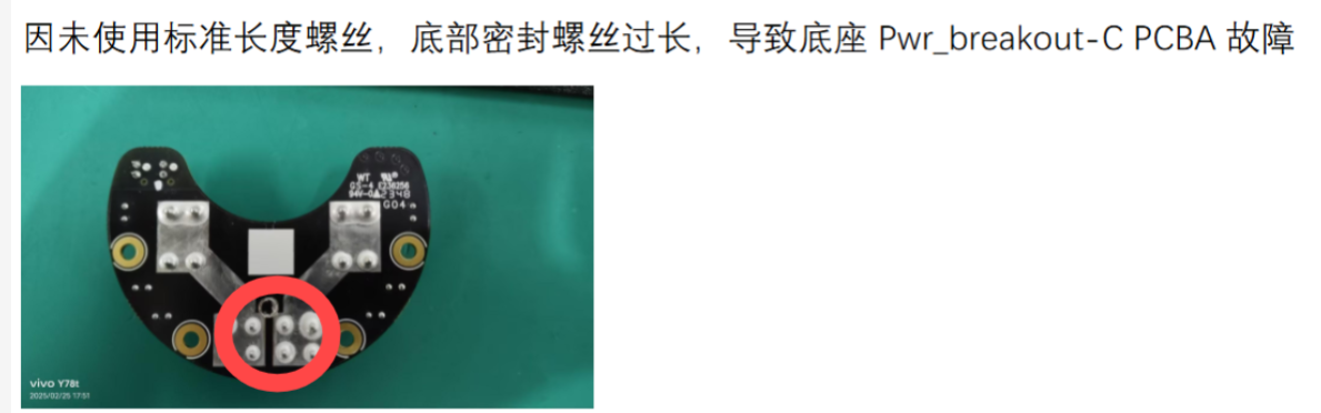 1.  底座密封螺丝如果过长,可能会使底座里的48V与GND短路,一般出厂时已密封好,客户拆卸后如果更换了该螺丝需要确认清楚。(如下图)(螺丝型号:M5X8)