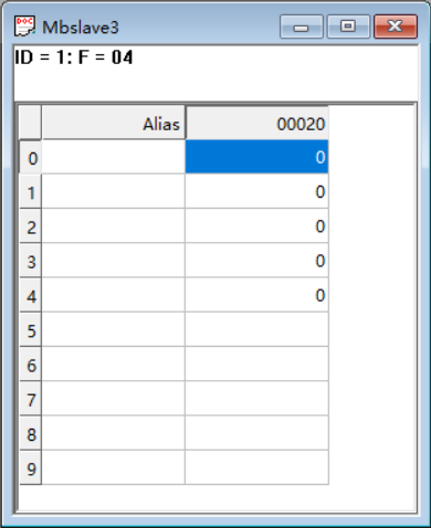 输入id 1,功能码04,地址20,数量5(自定义),点击ok