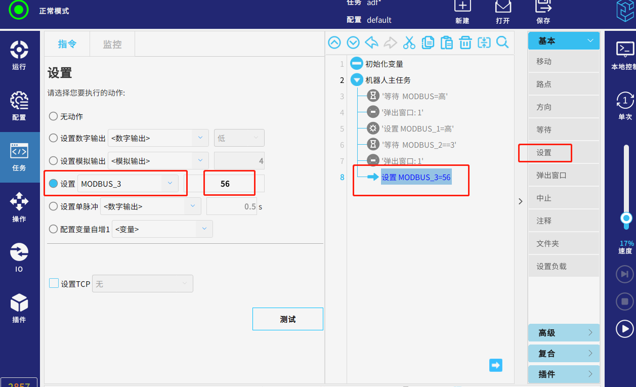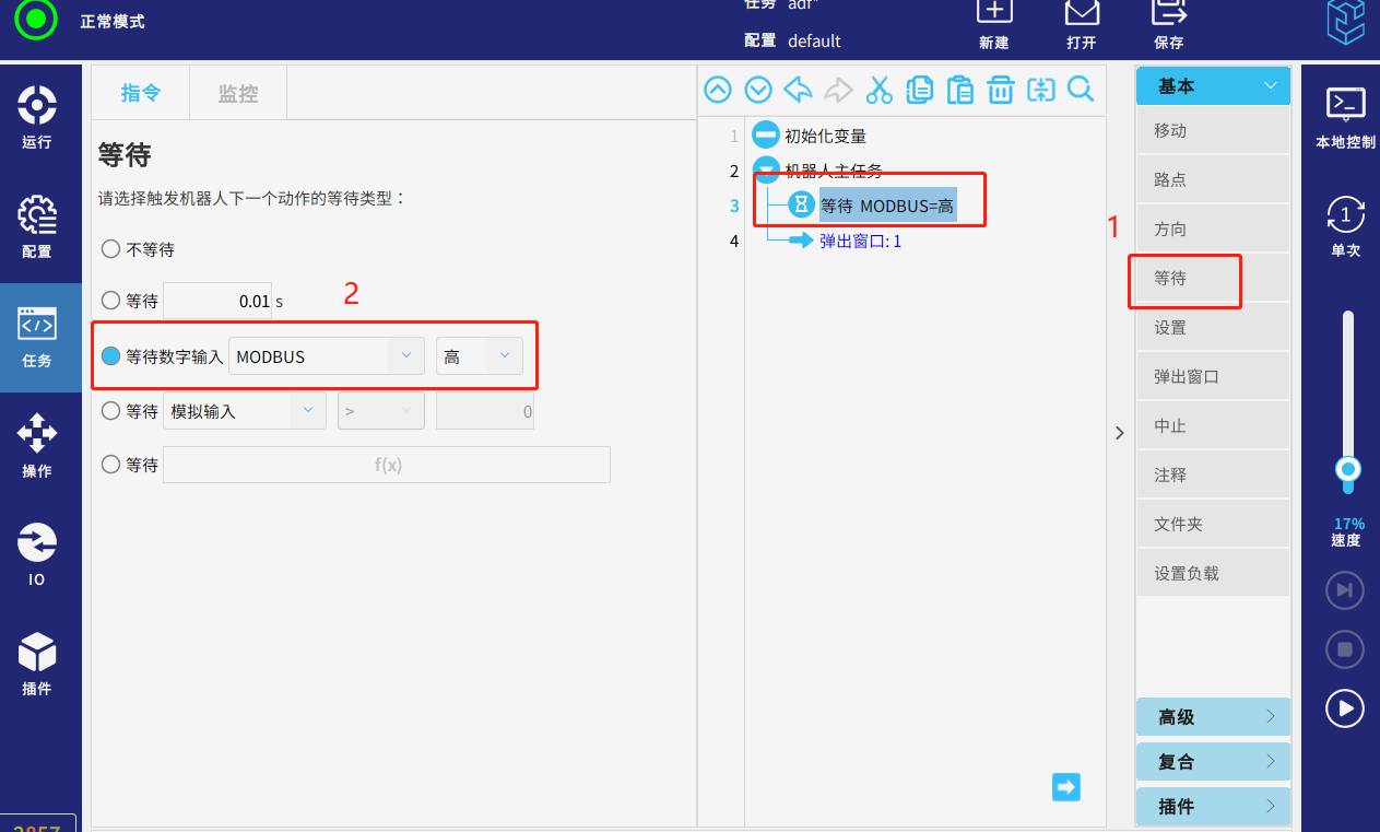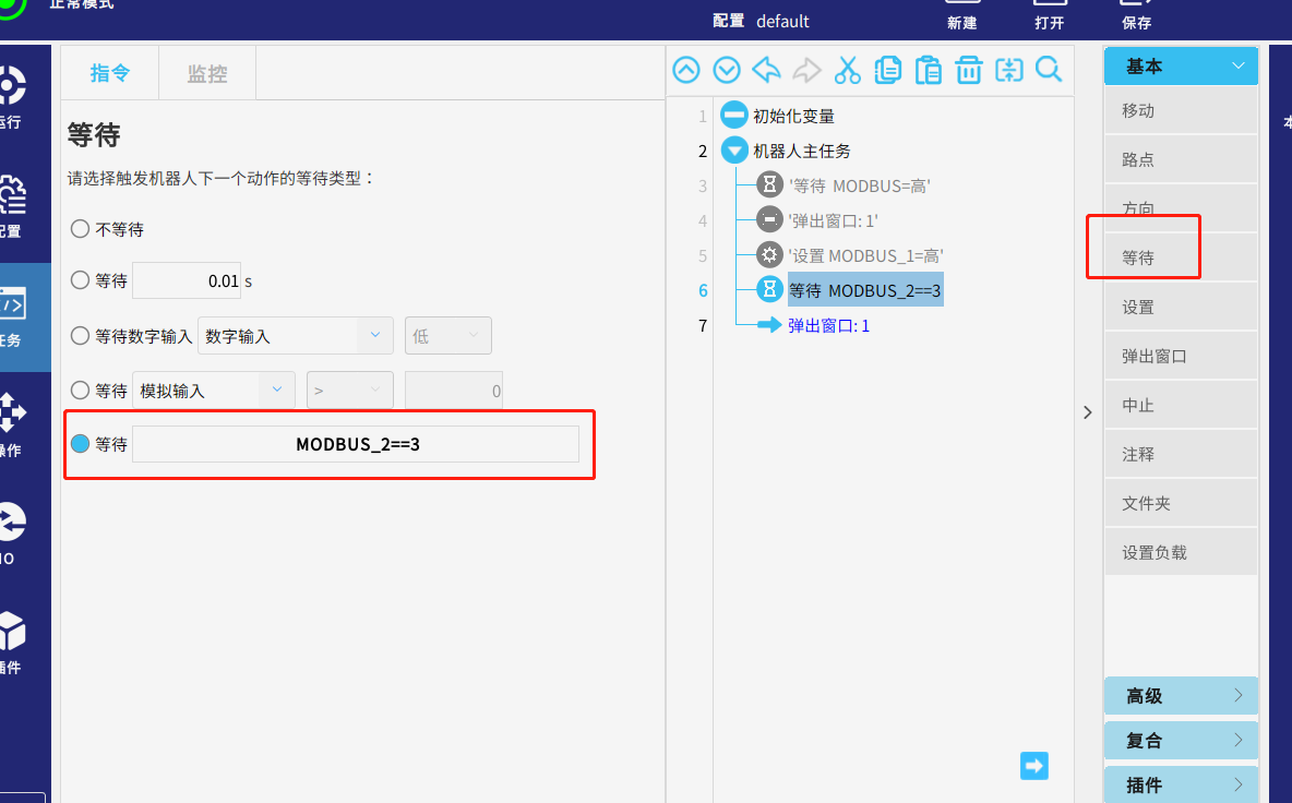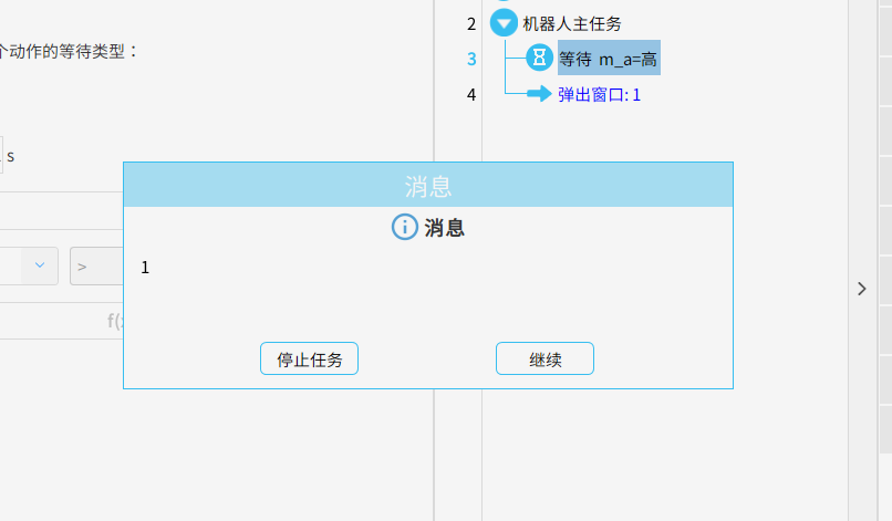 运行任务,当从站的信号modbus_2=3 时 ,页面弹出窗口提示“1”,代表已获取到该寄存器的值