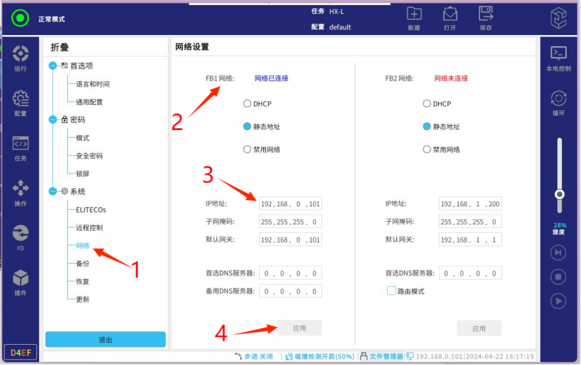 第三步-选择网络——FB1网络(静态地址)——输入(IP地址,子网掩码,默认网关)——点击“应用“(FB1网络显示网络已连接则表示连上)