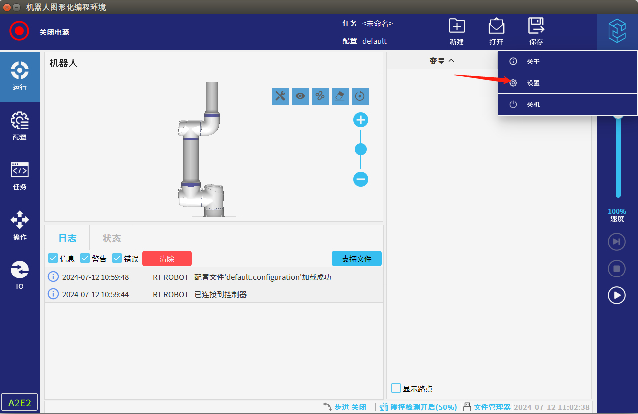 2. 打开机器人软件后,点击右上角NG28娱乐log点击设置。