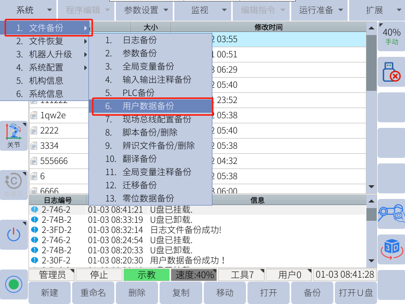用户数据备份可备份出所有jbi和lua文件,也包括用户plc,全局变量及注释等;一般复制一台机器人应用的程序到另一台机器人的时候,可以使用用户数据备份;