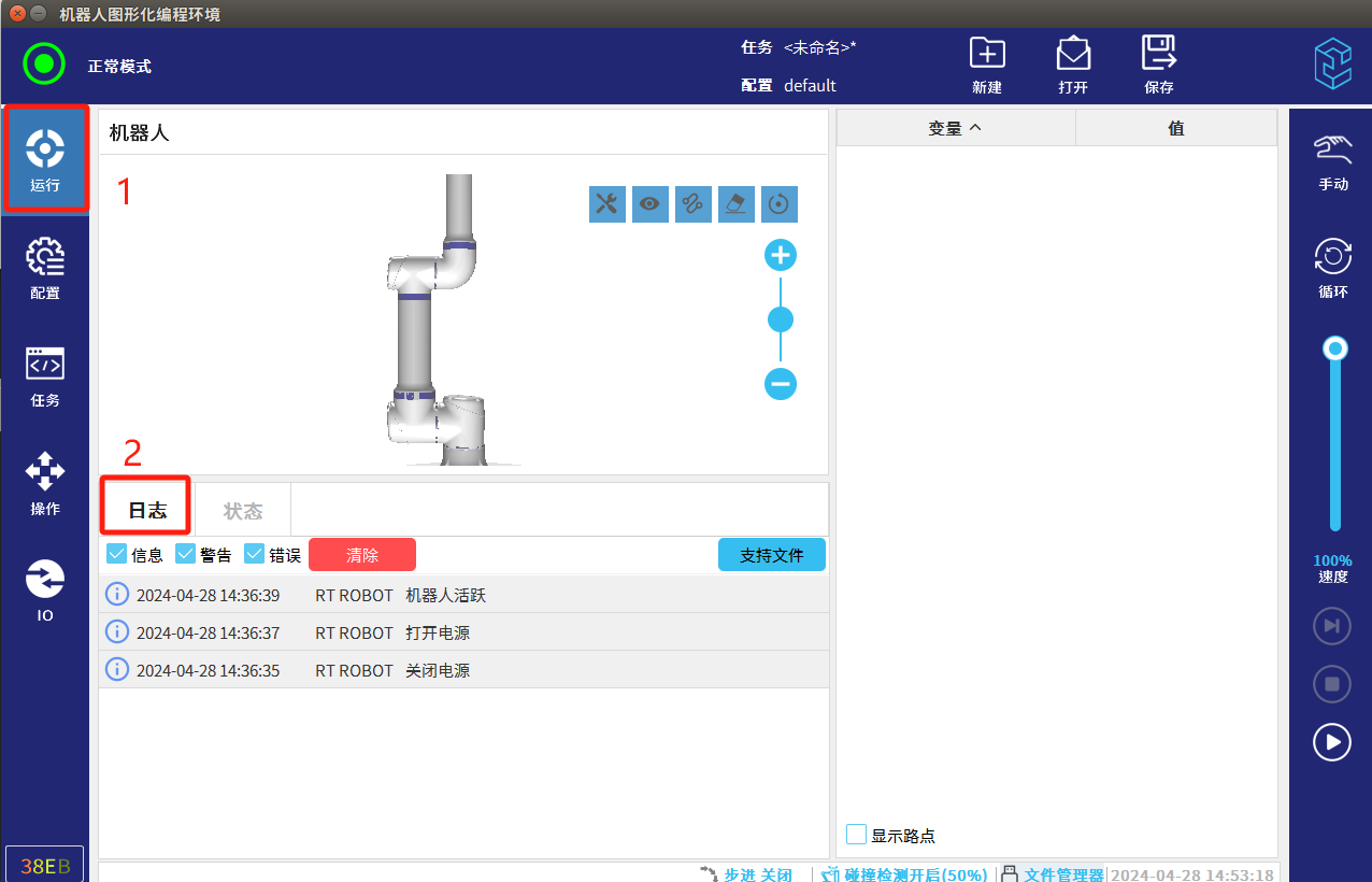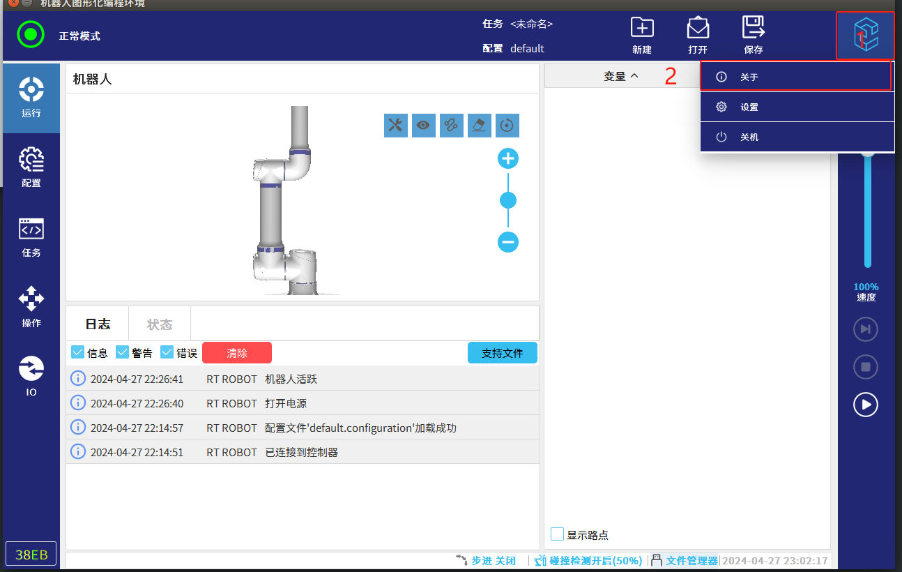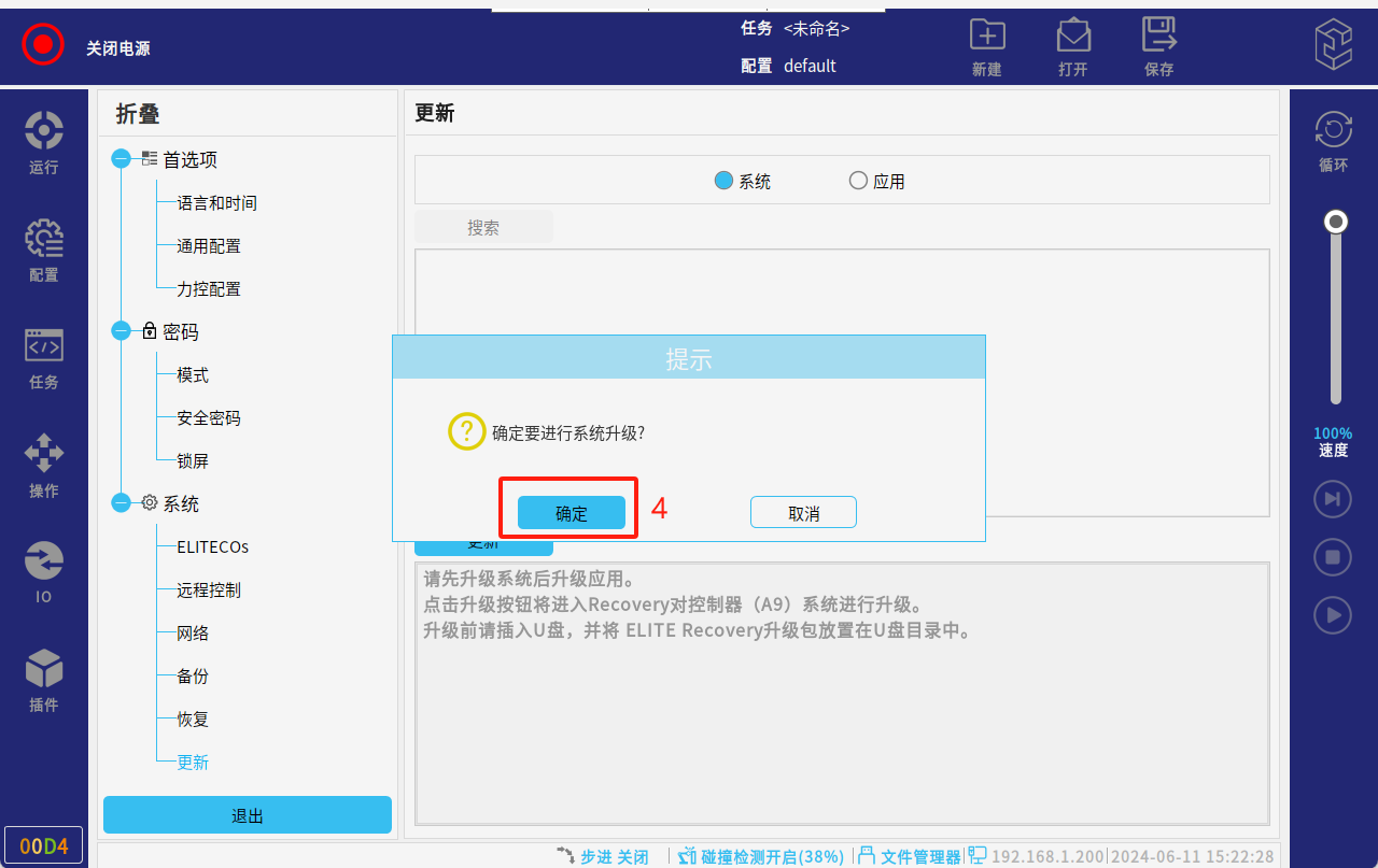 调试阶段建议全部勾选进行升级,也可单独勾选应用升级(应用:系统版本,一般是解决应用软件的bug和界面优化;MCU: 指伺服升级;驱动IO:指末端IO的升级)。点击“是”,会自动进行更新系统;请勿操作机器人或将其断电。等待更新后重启。