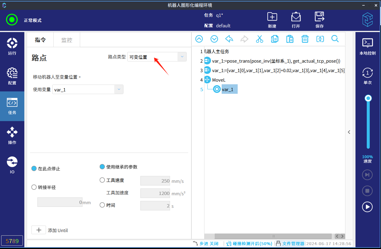 获取到用户坐标下位姿之后,可更改该数据,插入moveL指令(位姿数据用movel指令,关节数据用movej指令)路点类型选择为可变路点。